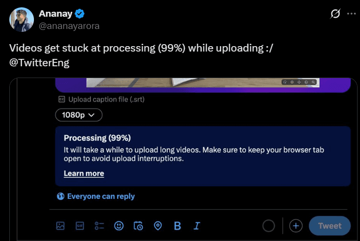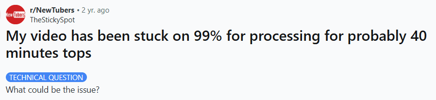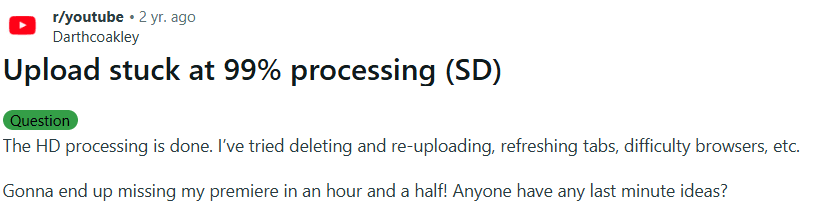 File / video uploads stuck (often at ~99% or “processing”) — creators miss deadlines and lose confidence.
